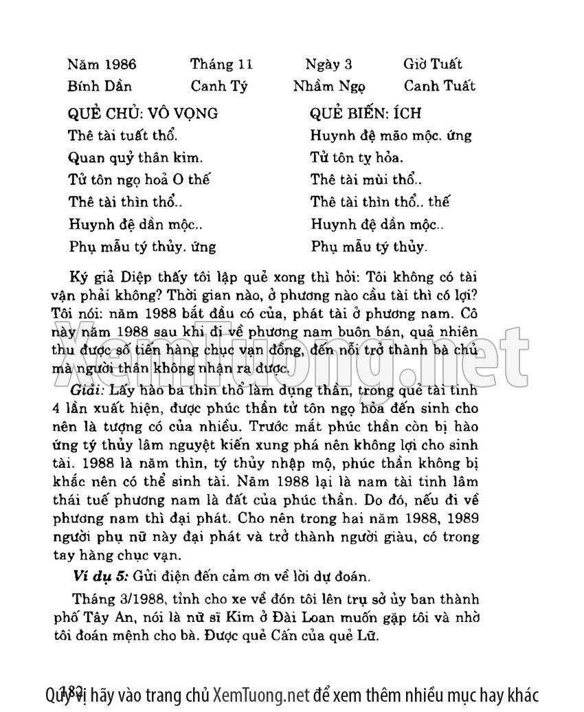 + Sách chủ yếu giới thiệu các ví dụ đoán quẻ tích lũy được trong thực tiễn của tác giả. Trong sách có phương pháp đoán theo tượng quẻ, đoán theo tượng hào và phương pháp đoán kết hợp. Ngoài ra có một số quẻ được chọn lựa từ tinh hoa của các học viên, một số nữa là chọn những quẻ hay, điển hình trong sách cổ. Trong lời giải quẻ luôn thể hiện nhất quán các phương pháp đoán quẻ cơ bản là: “một hào động”, “tượng quẻ”, “dịch lí”, “số lí”, “ngũ hành sinh khắc” và “ngoại ứng”.
