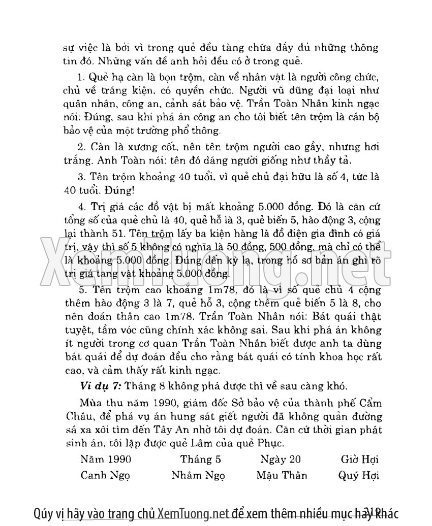 + Sách chủ yếu giới thiệu các ví dụ đoán quẻ tích lũy được trong thực tiễn của tác giả. Trong sách có phương pháp đoán theo tượng quẻ, đoán theo tượng hào và phương pháp đoán kết hợp. Ngoài ra có một số quẻ được chọn lựa từ tinh hoa của các học viên, một số nữa là chọn những quẻ hay, điển hình trong sách cổ. Trong lời giải quẻ luôn thể hiện nhất quán các phương pháp đoán quẻ cơ bản là: “một hào động”, “tượng quẻ”, “dịch lí”, “số lí”, “ngũ hành sinh khắc” và “ngoại ứng”.