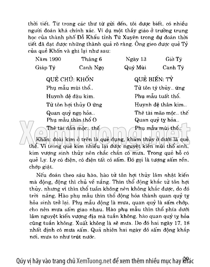 + Sách chủ yếu giới thiệu các ví dụ đoán quẻ tích lũy được trong thực tiễn của tác giả. Trong sách có phương pháp đoán theo tượng quẻ, đoán theo tượng hào và phương pháp đoán kết hợp. Ngoài ra có một số quẻ được chọn lựa từ tinh hoa của các học viên, một số nữa là chọn những quẻ hay, điển hình trong sách cổ. Trong lời giải quẻ luôn thể hiện nhất quán các phương pháp đoán quẻ cơ bản là: “một hào động”, “tượng quẻ”, “dịch lí”, “số lí”, “ngũ hành sinh khắc” và “ngoại ứng”.