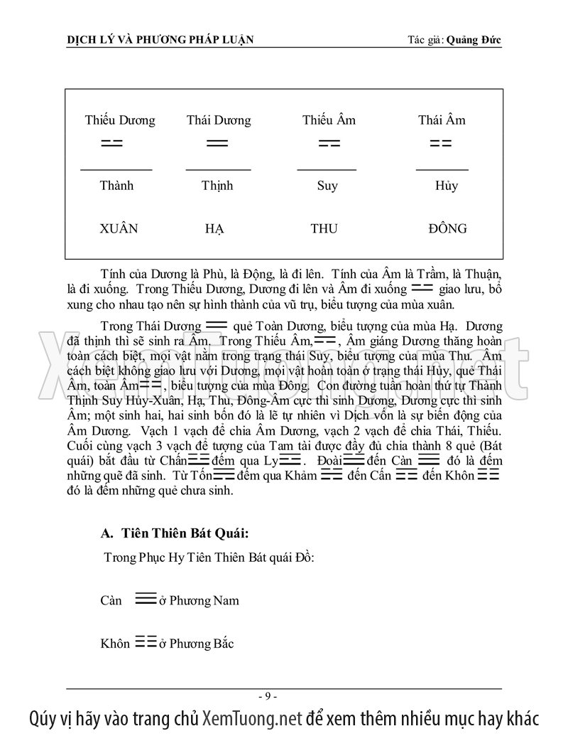 Sách "Dịch lý và phương pháp luận" của tác giả Quảng Đức được tóm soạn vào năm 1980 mới đầu dùng để làm tài liệu hướng dẫn các lớp Dịch học tại Việt Nam, tổ chức riêng lẻ tại Nha Trang. Thành phần tham dự đều là các tu sĩ Phật Giáo cho nên phần đầu căn bản về Âm Dương, Ngũ hành sinh khắc hầu hết đã thấu triệt, chỉ đi thêm sâu vào phần phương pháp luận đoán.