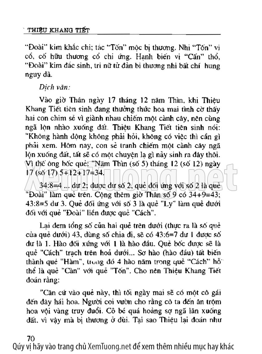 Cuốn sách "Mai Hoa dịch số" được xem là bộ kỳ thư độc đáo trong lịch sử văn hóa Trung Hoa, là viên ngọc quý của khoa chiêm bốc dự đoán học, tương truyền do Thiệu Khang Tiết, nhà đại triết học đời Tống biên soạn. Nền tảng của Mai hoa dịch số là Kinh Dịch, nội dung là các phép gieo quẻ đoán quẻ rất linh hoạt dựa trên tượng số bát quái.