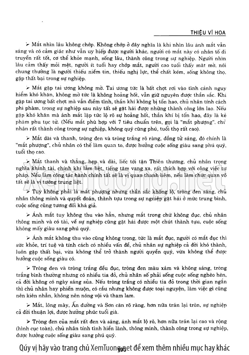 Sách "Tìm hiểu nhân tướng học theo kinh dịch" của tác giả Thiệu Vĩ Hoa cho chúng ta một cách nhìn toàn diễn về bản chất của thuật nhân tướng. Hầu hết chúng ta khi nói đến tướng thuật đều nghĩ đến khuôn mặt. Tuy nhiên như vậy có nghĩa là chỉ quan tâm đến phần hình dạng bên ngoài mà chưa chú trọng đến bản chất bên trong của thuật nhân tướng. Tướng thuật là nhìn tướng một người mà đoán được tuổi thọ, tài lộc, vận hạn... của họ, thậm chí của tổ tiên, cha mẹ, anh chị em trong gia đình người đó.
