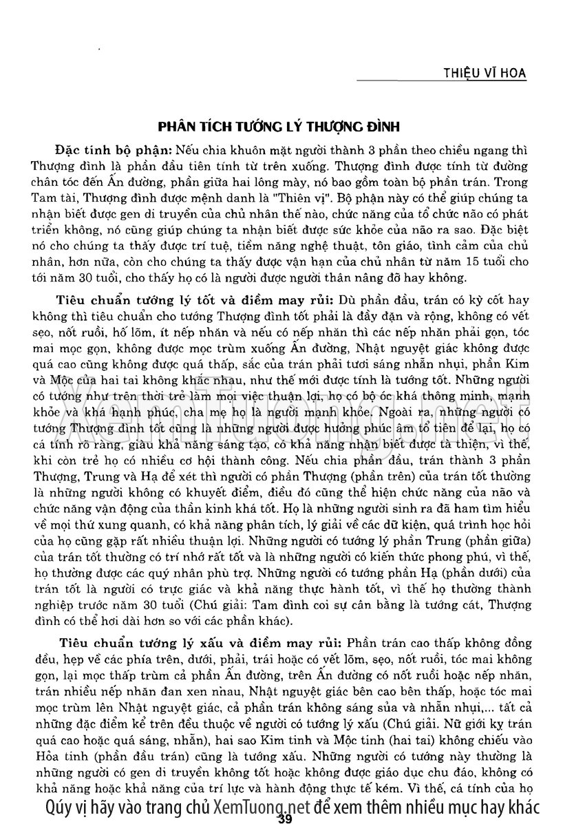 Sách "Tìm hiểu nhân tướng học theo kinh dịch" của tác giả Thiệu Vĩ Hoa cho chúng ta một cách nhìn toàn diễn về bản chất của thuật nhân tướng. Hầu hết chúng ta khi nói đến tướng thuật đều nghĩ đến khuôn mặt. Tuy nhiên như vậy có nghĩa là chỉ quan tâm đến phần hình dạng bên ngoài mà chưa chú trọng đến bản chất bên trong của thuật nhân tướng. Tướng thuật là nhìn tướng một người mà đoán được tuổi thọ, tài lộc, vận hạn... của họ, thậm chí của tổ tiên, cha mẹ, anh chị em trong gia đình người đó.