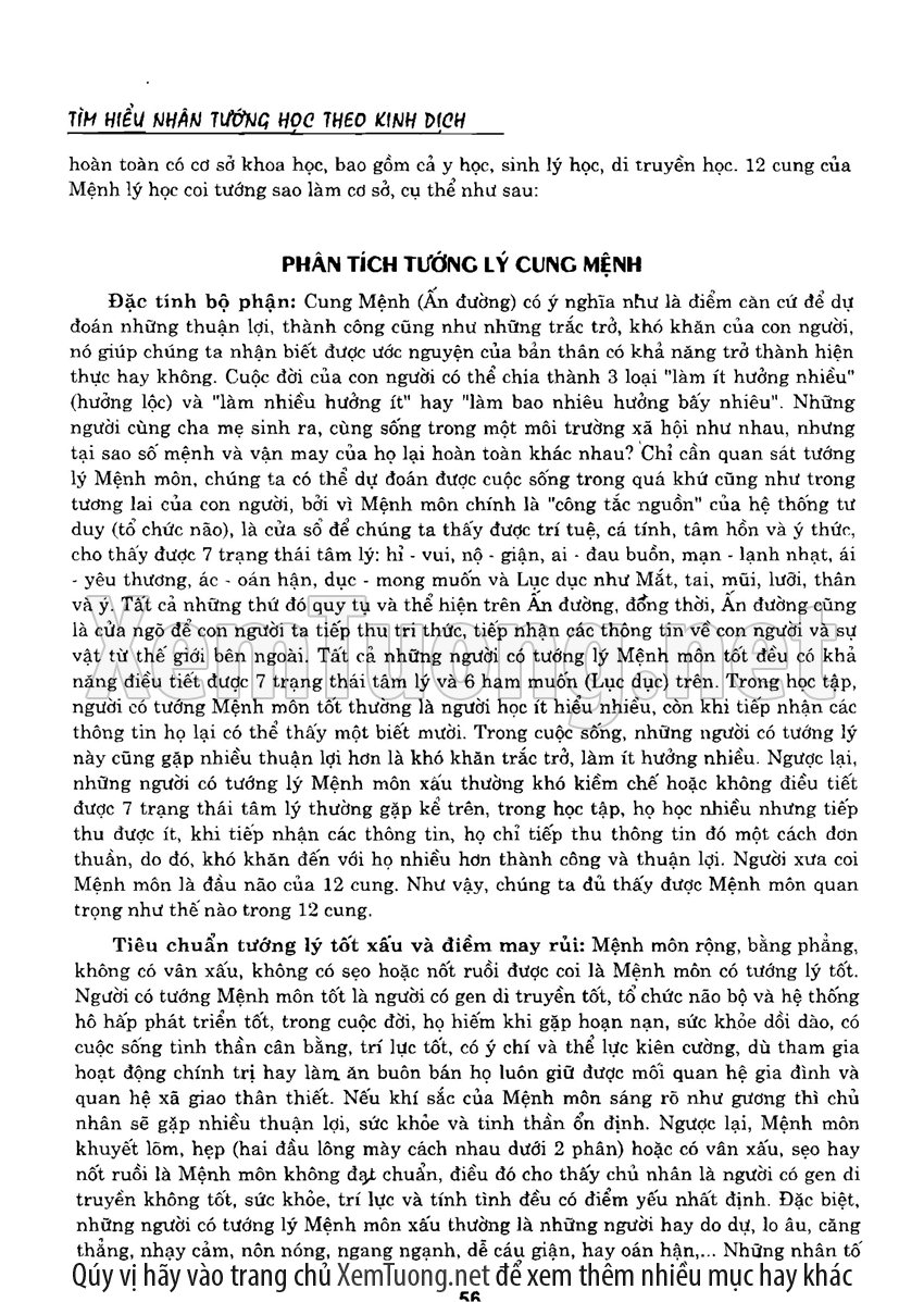 Sách "Tìm hiểu nhân tướng học theo kinh dịch" của tác giả Thiệu Vĩ Hoa cho chúng ta một cách nhìn toàn diễn về bản chất của thuật nhân tướng. Hầu hết chúng ta khi nói đến tướng thuật đều nghĩ đến khuôn mặt. Tuy nhiên như vậy có nghĩa là chỉ quan tâm đến phần hình dạng bên ngoài mà chưa chú trọng đến bản chất bên trong của thuật nhân tướng. Tướng thuật là nhìn tướng một người mà đoán được tuổi thọ, tài lộc, vận hạn... của họ, thậm chí của tổ tiên, cha mẹ, anh chị em trong gia đình người đó.