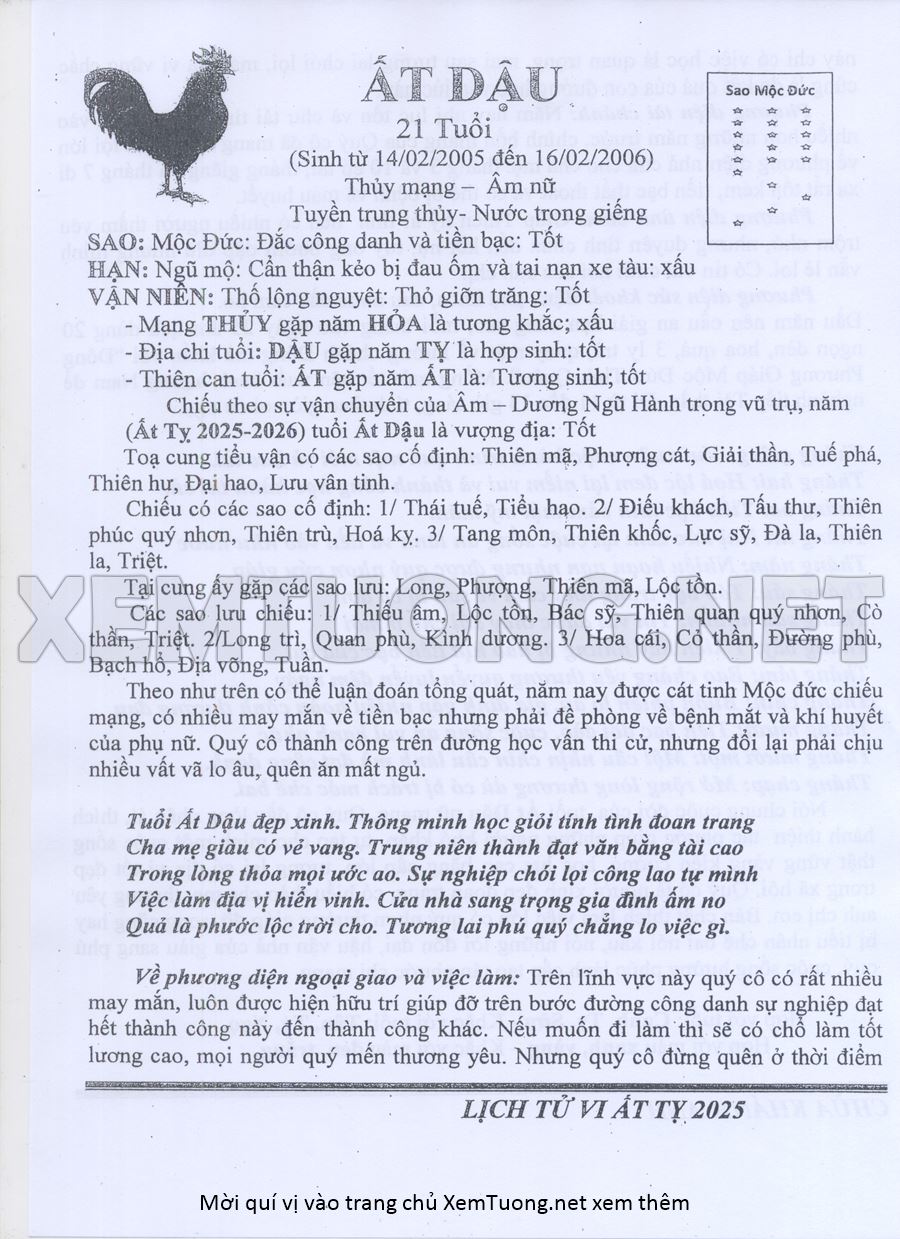 Tử Vi Năm Ất Tỵ 2025 mạng nữ ẤT DẬU
