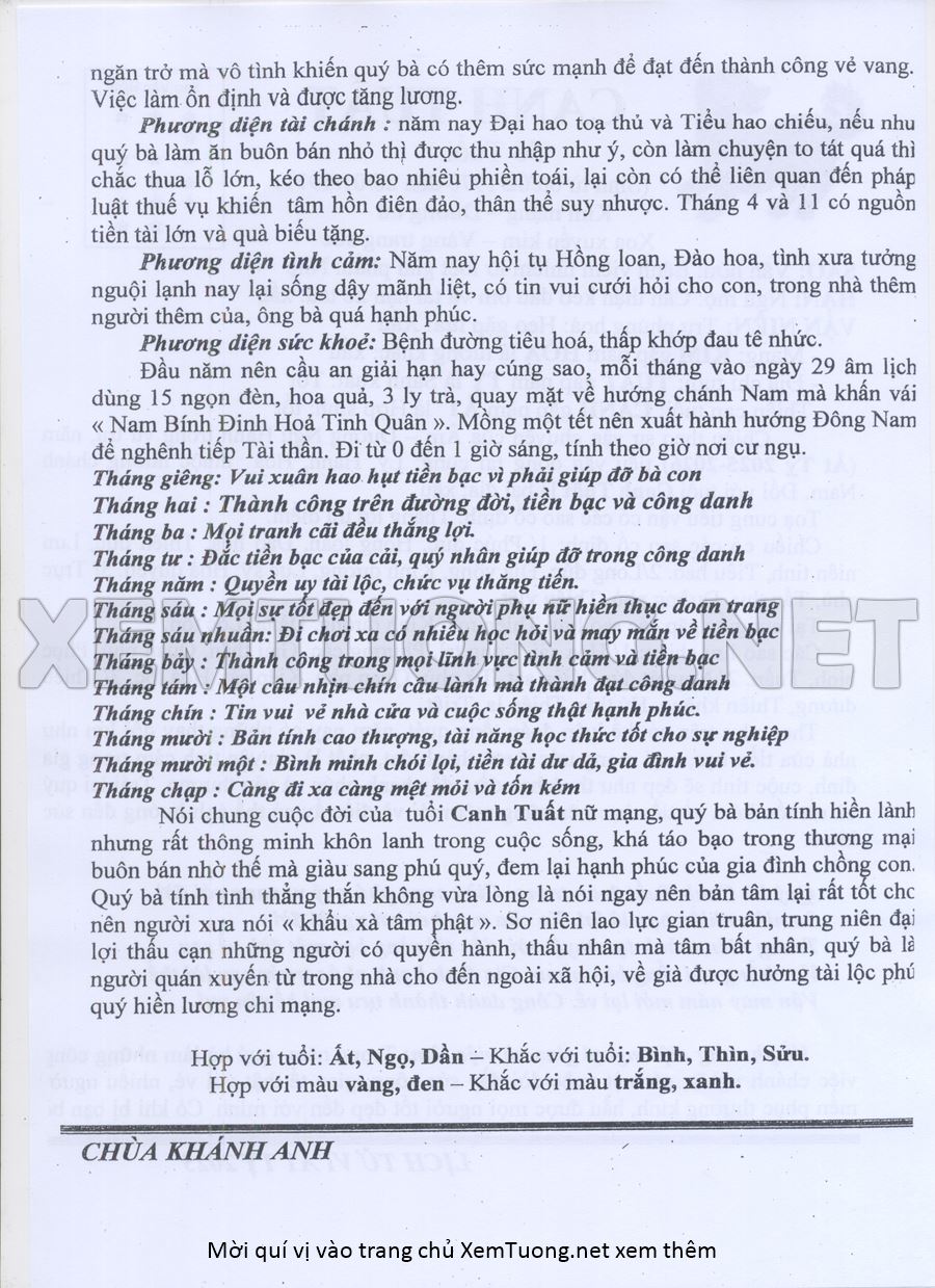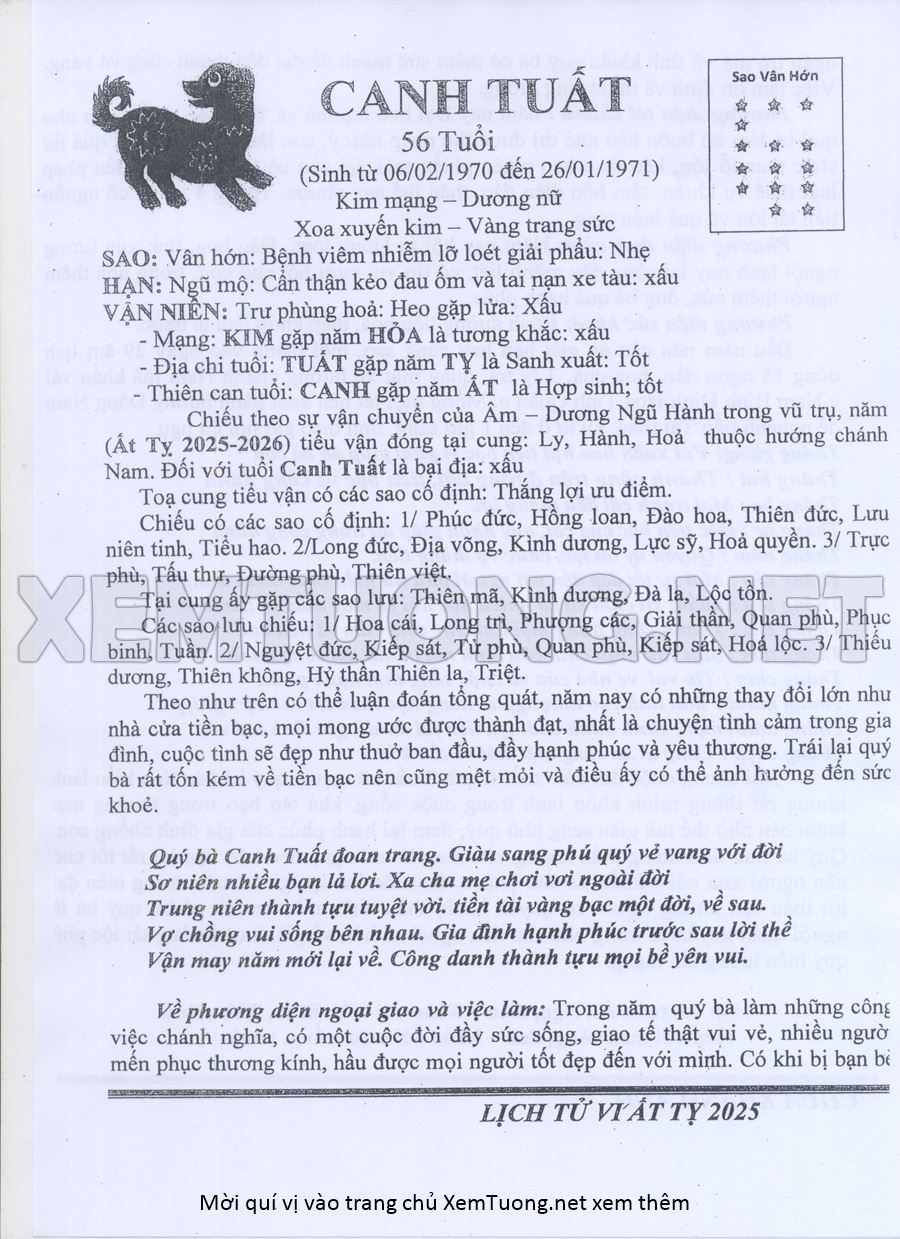 Tử Vi Năm Ất Tỵ 2025 mạng nữ CANH TUẤT