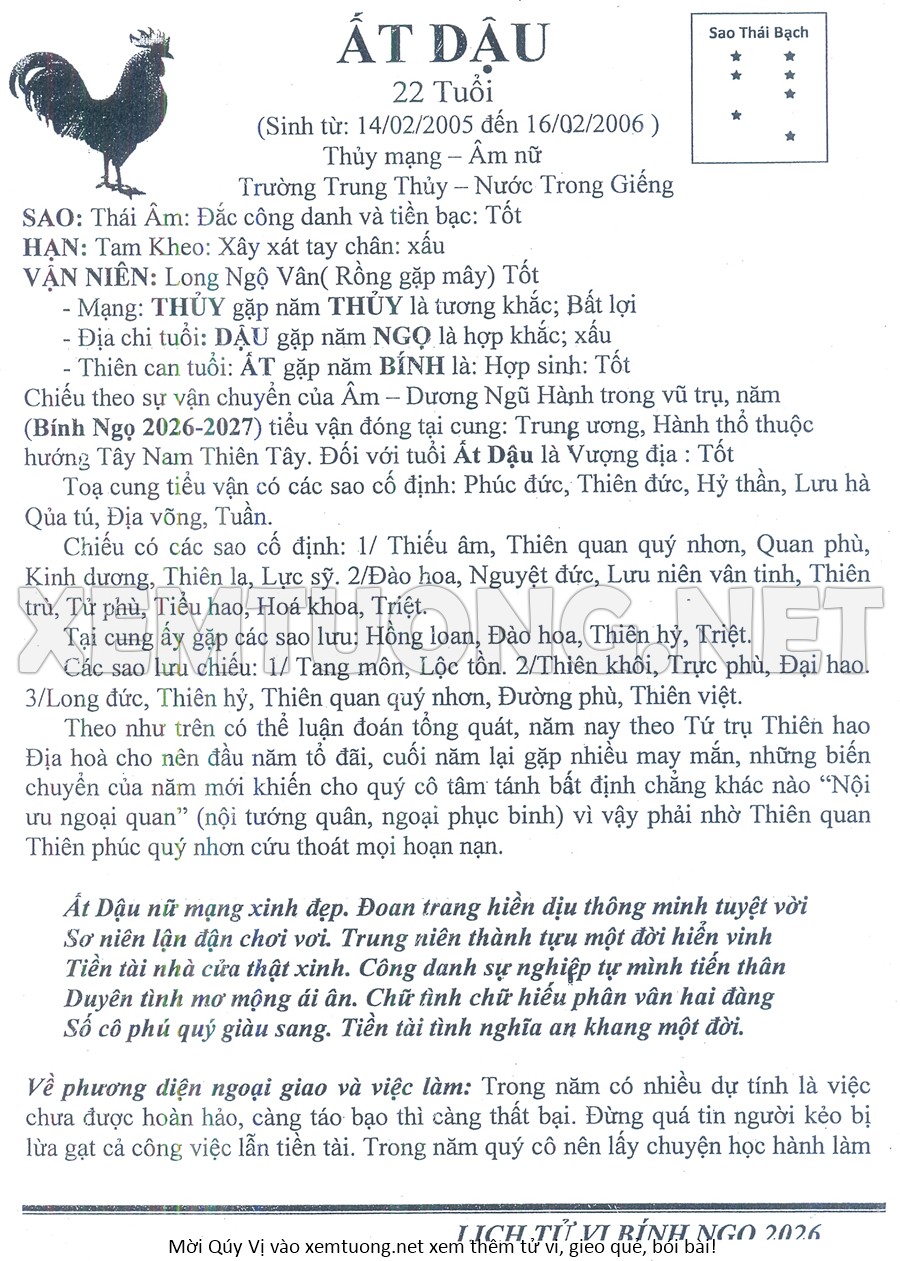 Tử Vi Năm Bính Ngọ 2026 mạng nữ ẤT DẬU