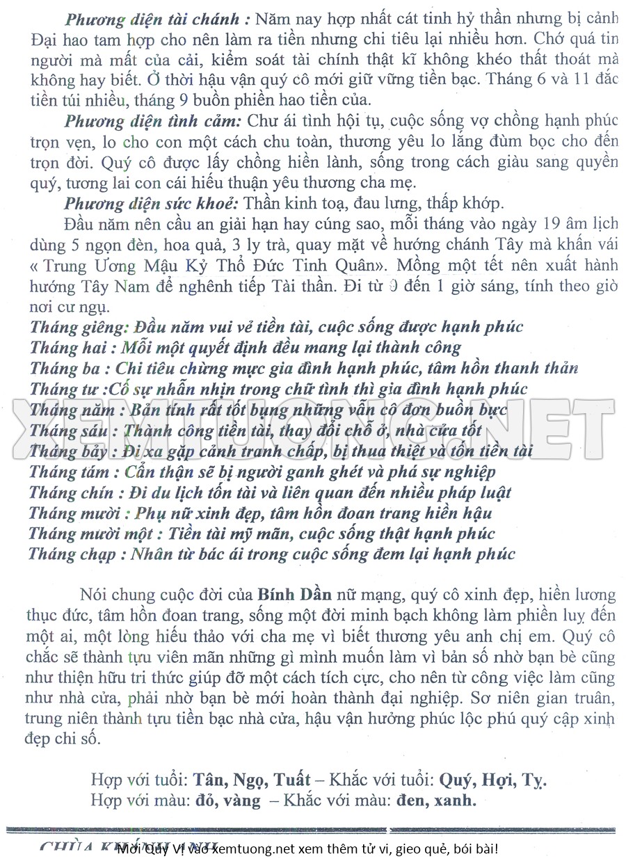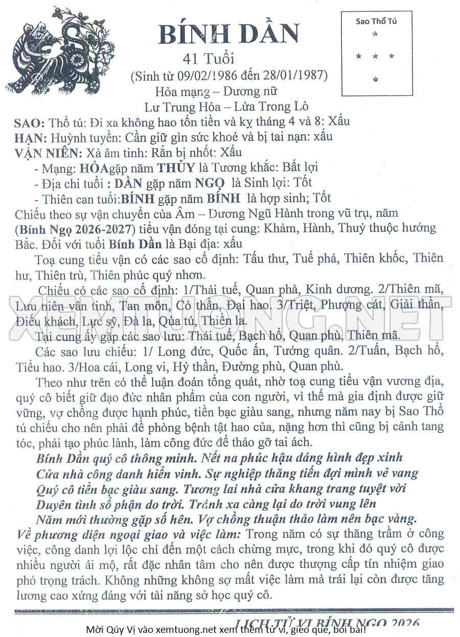 Tử Vi Năm Bính Ngọ 2026 mạng nữ BÍNH DẦN