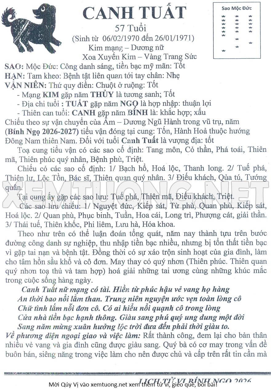 Tử Vi Năm Bính Ngọ 2026 mạng nữ CANH TUẤT