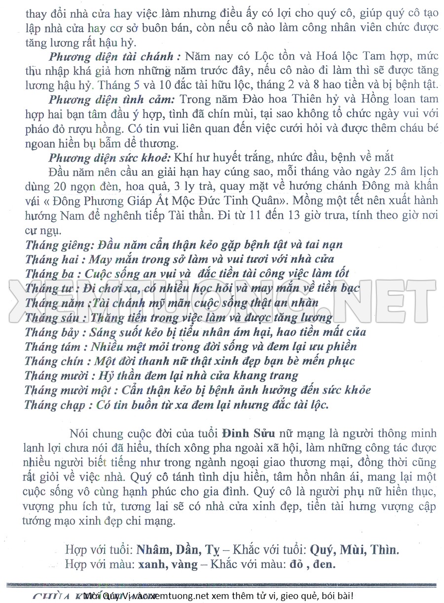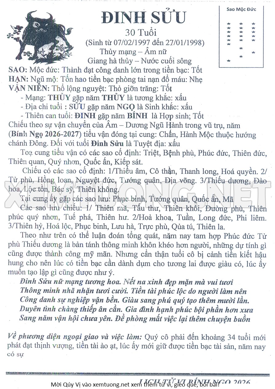 Tử Vi Năm Bính Ngọ 2026 mạng nữ Đinh SỬU