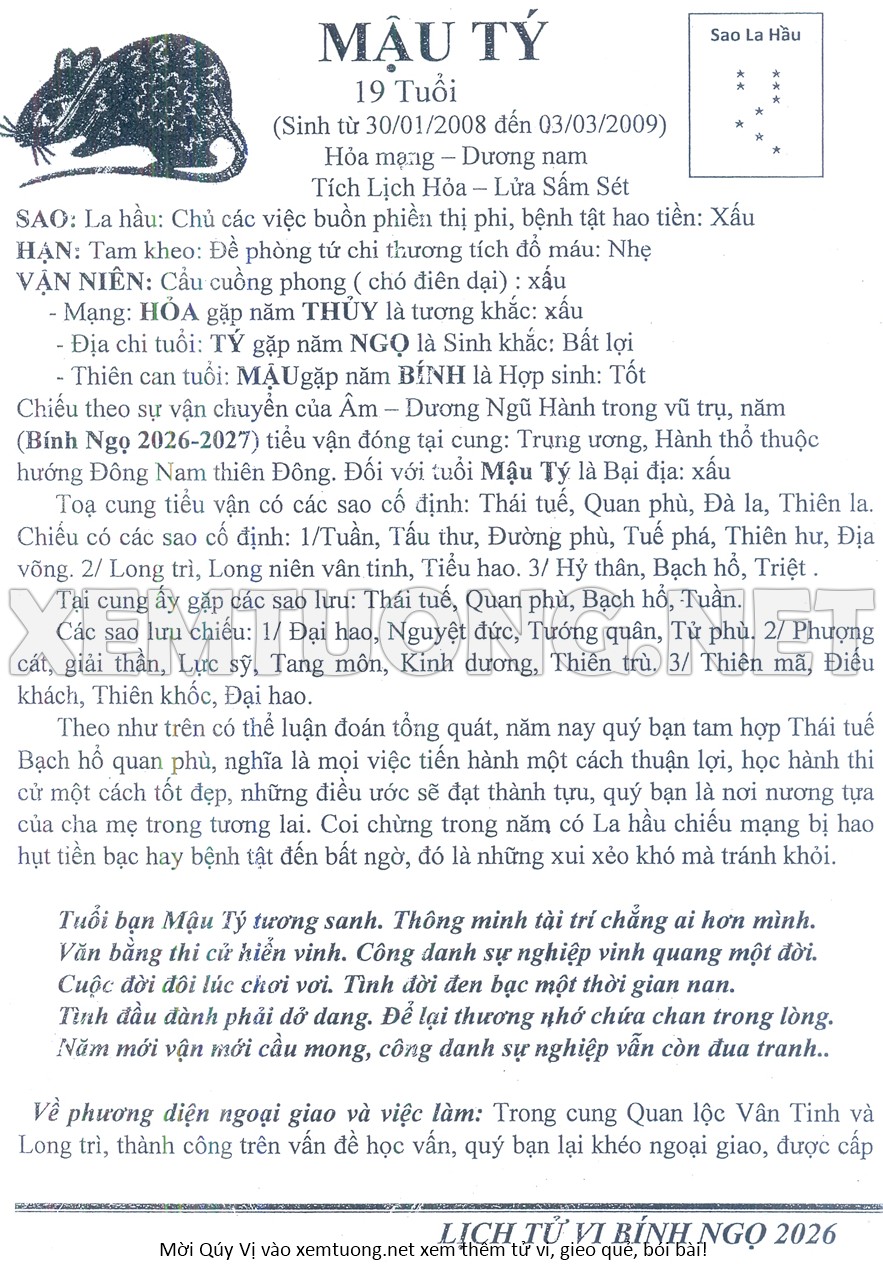 Tử Vi Năm Bính Ngọ 2026 mạng nam MẬU TÝ