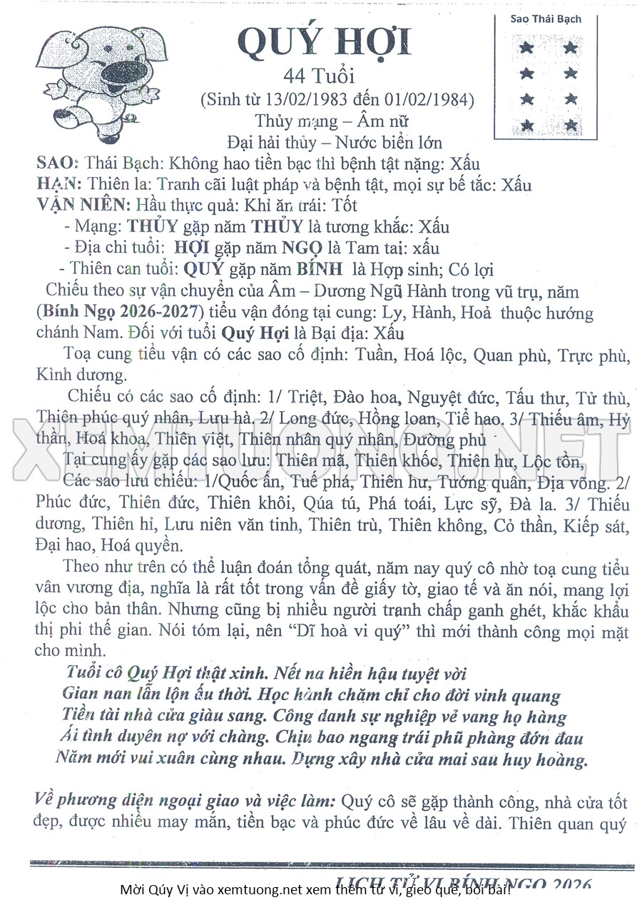 Tử Vi Năm Bính Ngọ 2026 mạng nữ QUÝ HỢI
